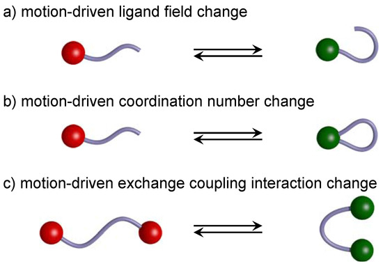 The most common approach to switch the total spin of a molecule in spin crossover, photomagnetic [39,40], or photochromic systems, is to use a stimulus directly modifying the electronic state of the site responsible for the magnetic properties. This review is focused on magnetic switches based on a mechanical motion enabling the stimulus to be targeted on a remote site. This approach is interesting since the two processes of motion and magnetic properties change are distinguished, so that a given mechanical switch can be combined with different functional units. Three main approaches to control magnetic properties by a mechanical motion can be outlined (Figure 2): (i) modulating the ligand-field strength by a change in configuration of the ligand; (ii) changing the coordination number; and, (iii) modulating the coupling between two spin-centers. These strategies will be developed in the following sections.