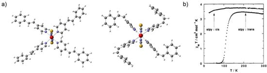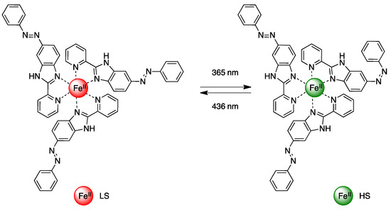 The first exemple of the LD-LISC effect was described by Zarembovich et al. in 1994 [42], with complex [FeII(stpy)4(NCS)2] bearing photo-isomerizable styryl pyridine ligand (stpy) (Figure 3). [FeII(trans-stpy)4(NCS)2] presents a spin crossover centered around 108 K, whereas [FeII(cis-stpy)4(NCS)2] remains HS on the whole temperature range (10–300 K). This difference in behavior was attributed to a higher ligand field for trans vs. cis isomer. The system was further improved [43] using bidendate ligand 4-methyl-4′-trans-styryl-2,2′-bipyridine to finally obtain a LD-LISC effect at room temperature [44]. By using ligands incorporating an azobenzene unit a reversible LD-LISC effect was obtained by Nishihara (Figure 4) [45]. When compared to styryl derivatives, azo compounds present a larger difference in the absorption spectra between trans and cis isomers, which enables a selective isomerization depending on the wavelength of the irradiation. The LS state is stabilized by trans isomer, while HS state by cis isomer and a modest 5% change in the spin-state conversion was observed in solution in acetone at room temperature.