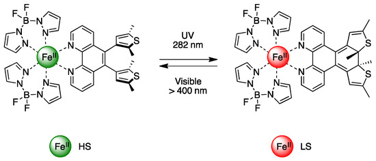 - Milek, M.; Heinemann, F.W.; Khusniyarov, M.M. Spin Crossover Meets Diarylethenes: Efficient Photoswitching of Magnetic Properties in Solution at Room Temperature. Inorg. Chem. 2013, 52, 11585–11592. [Google Scholar] [CrossRef] [PubMed]