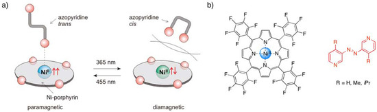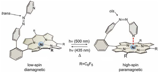 In a first approach, azopyridines were used as photodissociable axial ligands to control the coordination number and concurrently the spin state of the Ni(II)-porphyrin (Figure 7) [52]. In the trans configuration, the azopyridines bind to the Ni as axial ligands, forming paramagnetic HS (S = 1) 1:1 and 2:1 complexes. Upon photoisomerization to the cis configuration, the steric hindrance significantly reduces the binding constant, leading to a dissociation of the apical ligand and a diamagnetic (S = 0) square-planar Ni(II). By using a large excess of an azopyridine substituted in 4 and 4′ position with an isopropyl group, the percentage of paramagnetic Ni centers was reversibly switched between 20.5% and 68.1%. In this system, the efficiency depends on the photostationary states of the ligand at the two irradiation wavelengths and the association constants of the two corresponding configurations.