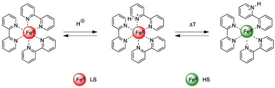 Very recently, Weber et al. described a proton-driven coordination-induced spin state switch (PD-CISSS) of [FeII(bipy)3]2+ complex [59] (Figure 9). By lowering the pH, LS [FeII(bipy)3]2+ is protonated to form a LS [FeII(bipy)3H]3+ complex that was observed by 1H-NMR. This protonation weakens the nitrogen–iron bond, leading to a reversible bond breaking between the iron center and the protonated nitrogen of the bipy ligands, resulting in a HS pentacoordinated Fe(II) complex upon heating. In this system, the mechanical motion of the ligand is triggered by a combination of a chemical stimulus (pH) and temperature. The effect was observed in solution and as composite materials encapsulated in the supercages of zeolite faujasite NaY [59].