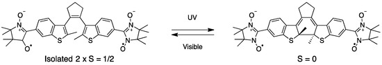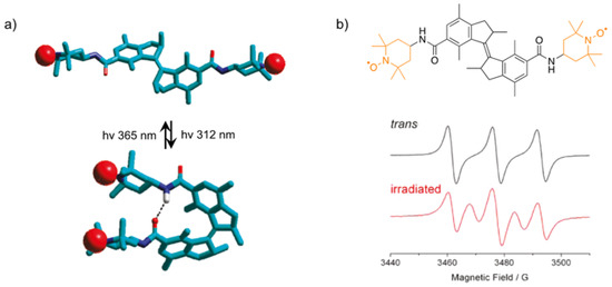 Feringa et al. [63] used the photoisomerization of an overcrowded double bond to switch the intramolecular through-space magnetic interaction between two (2,2,6,6-Tetramethylpiperidin-1-yl)oxyl (TEMPO) spin centers (Figure 13). In the trans state, the two spin centers are well separated by a distance of ~22 Å, resulting in a non-coupled system, as shown by the three-line electron paramagnetic resonance (EPR) spectrum. Upon photoswitching, the trans form is converted to a cis conformation, where the two radicals are separated by ~7 Å. The two spins are strongly interacting by a through space dipolar coupling, as shown from the five-line EPR spectrum. This switching is obtained at room temperature and in solution, but the conversion is limited by the photostationary state of 89% cis form.