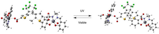 A similar strategy has been used by Yamashita et al. to repeatedly turn on and off the SMM (Single Molecule Magnet) behavior of two Mn(III)-salen complexes that are connected to diarylethene derivatives with two carboxyl groups (Figure 11) [61]. When the complex with the diarylethene in the closed form is converted to the open form by irradiating with visible light, slow relaxation of the magnetization was observed. This behavior, not observed for the closed form, is due to slight modifications in inter- or intra-unit Mn(III)-Mn(III) distances upon photoisomerization. In addition, the superexchange interactions between the two Mn(III) ions caused by the π-conjugation of the two thiophene rings affects the magnetic properties of the two forms. In this example, the magnetic properties are interestingly activated upon irradiation with visible light.