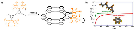 (a) Folding of polyradical polymer upon pH change; (b) χT = f(T) of unfolded (green), and folded structure (red). Reprinted with permission from [62]. Copyright American Chemical Society, 2013.