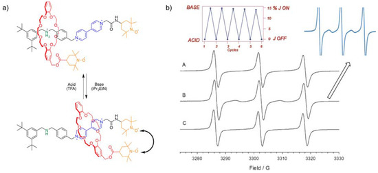 A similar control of the interaction between two TEMPO radical moieties was recently described by Credi et al. [64] using an acid–base switchable molecular shuttle (Figure 14). The shuttle is based on a [2]rotaxane, bearing stable TEMPO radical units on the ring and on the side of the axle. The ring is located on the dialkylammonium station when it is protonated, resulting in non-coupled radicals with a characteristic three-line EPR spectrum. Upon deprotonation, the ring moves to the bispyridinium site and the two radicals become coupled by through space dipolar interaction, as observed from the five-line EPR spectrum. The process is reversible, and was repeated six times, highlighting the stability of the system. Thus the mechanical motion of the ring triggered by a chemical stimulus (pH) in this molecular machine enables a reversible on/off switching of magnetic interactions.