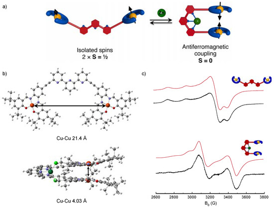 (a) Principle of the control of the exchange interaction between two paramagnetic centers by using the mechanical motion of switchable molecular tweezers; (b) Crystal structure of open and closed terpy(Cu-salphen)2 tweezers and (c) corresponding EPR spectra in frozen solution showing a signal characteristic of isolated 2 × S = 1/2 spins in the open form, and a doublet signal corresponding to S = 1 system resulting from dipolar interaction between the two Cu(II) in the closed form. Adapted from [67] with the permission of The Royal Society of Chemistry.