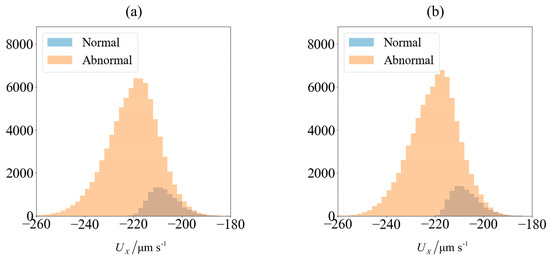 b are generated using the relevant mean and standard deviation. The distribution of computed velocity is presented as a histogram of normal cells super-imposed over the histogram of abnormal cells. The machine learning model is trained using 10,000 of those samples, and based on the parameters of the remaining 90,000 cells, their overall velocity distribution is predicted as shown in