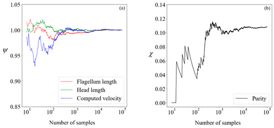 Before proceeding, it is necessary to determine the quantity of data required to obtain convergence in the results, so that a benchmark is available for subsequent comparisons. The cumulative mean flagellum length, head length, and computed velocity are presented in