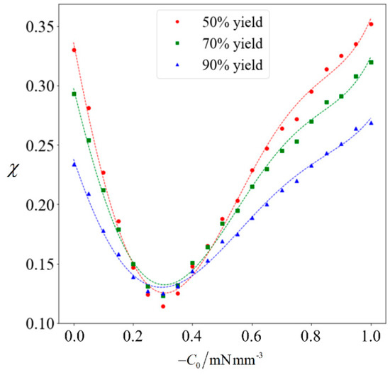 5 samples, and a best-fit polynomial is added for the respective target yield. It can be observed that when the magnitude of