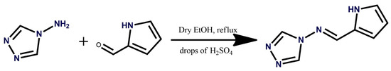 The ligand 4-((1H-pyrrol-2-yl)methylene-amino)-4H-1,2,4-triazole (pyrtrz) (Figure 1) was prepared by the condensation reaction [35,36]: 4-Amino-1,2,4-triazole (1.68 g, 0.02 mol, 1.0 eq.) and pyrrole-2-carboxaldehyde (2.09 g, 0.022 mol, 1.1 eq.) were dissolved in ethanol with the addition of few drops of H2SO4, acting as acidic catalyst. The reaction mixture was slowly heated up to 80 °C until it started to boil, then kept refluxing for 10 h. When it cooled down to r.t., the excess of the solvent was removed by rotary evaporator at 35 °C. The products such obtained was washed with small amount of cold ethanol, diethyl ether and then dried in the desiccator with phosphorus pentoxide as dry agent. Dark purple powder was obtained. Yield: 3.14 g (97.5%), m.p., 207.5–210.7 °C; IR (KBr): 1635 cm−1 (vw), 3127 (w), 1169 (s), 1062 (vs), 860 (s), 762 and 621 cm−1 (Ar, CH-strech); 817 cm−1, 2918 cm−1 (Ar-CH3). 1H-NMR (Figure S1) (CD3OD) 7.91 (s, 1H, Ar–H), 7.99 (s, 1H, Ar–H), 8.92 (s, 1H, H–C=N), 9.07 (s, 2H, triazole).