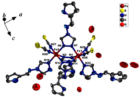 Compound 1 crystallizes in the triclinic space group P-1. The asymmetric unit contains one full neutral binuclear complex plus 7 lattice water molecule positions. However, some of these positions are partially occupied resulting in a total of 4 water molecules in the structure. As shown in Figure 2, for each molecule, the two FeII centers are linked through three µ2-N1,N2-triazole bridges with the distance of 3.988(7) Å. Each FeII coordination sphere is further completed by one nitrogen (N16 and N22) atom from the terminal triazole ligand, two nitrogen (N26, N27 and N28, N29) atoms via cis-thiocyanate anions. The terminal average Fe−N bond length of 2.113(3) Å is shorter than the central average Fe−N bond length of 2.159(3) Å (Table S3). In both cases, the bond distance confirms the Fe centers being in the high-spin state at 173 K [37], which is further confirmed by magnetic measurements (see below). The NCS− anions are almost linear with the N–C–S angle around 178°; the angle of coordination to iron Fe–N–C is split into two groups with the angle being around 160° and 175° (Table S3). Within the structure, one of the terminal thiocyanates is disordered over the C39–S4 bond part with a relative occupancy of 2:1.