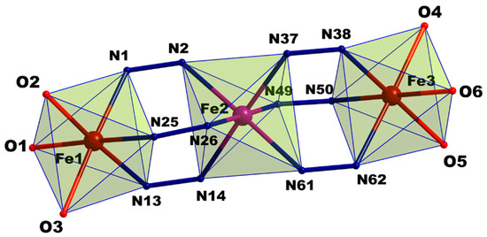 Compound 2 crystallizes in monoclinic space group P21/c. Within the linear trinuclear basic units, the FeII ions are linked by three µ2-N1,N2-donating triazole ligands, the terminal coordination sites are occupied by three H2O molecules to complete the [N3O3] hexa-coordination (Figure 5). Quite surprisingly, this structure consists of three complete Fe centers within the asymmetrical units, where there are only three other examples among the 17 reported linear trimer analogues, including one new example published February this year (2018) (Table S2) [21,22,38]. While the central Fe2 is in an octahedral [FeN6] coordination environment, the outer FeII ion, Fe1 and Fe3, are in a [FeN3O3] coordination environment due to the coordination of the terminal water molecules. Each trinuclear unit is cationic with a 6+ charge, which is balanced by six free p-toluenesulfonate counteranions. Interestingly, due to different groups of H-bonding and π stacking (Figure 6, Tables S4 and S5), the p-toluenesulfonate ions are distributed unequally around the three linear Fe units. This unique feature makes the Fe centers crystallographically independent reflected by the monoclinic space group with three independent Fe centers within the asymmetrical unit. The X-ray analysis also reveals two methanol and ten water molecules linked to the trinuclear units via different H-bonding interactions, as some atoms are only partially occupied, resulting only in a total of one methanol and 6.5 water molecules identified. The hydrogen atoms from the water molecules are not defined here, thus potential supramolecular interactions involved are not discussed here. Though a significant point needed to be pointed out is that six out of the ten water molecules scattered exclusively along one side of the trimer with another one (O29) embedded in the middle of the trimer units. The uneven distribution of the water molecules is balanced by the unequally distributed p-toluenesulfonate anions. This further supports the uniqueness of the structure (Figure 5).