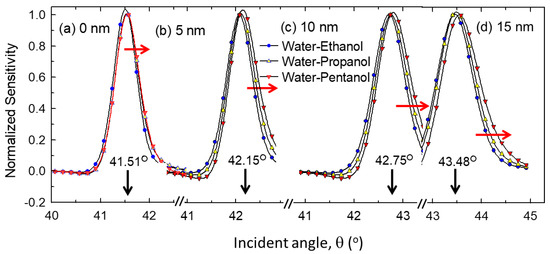 | water–propanol (0.0492) | 41.60° (0) | 42.20° (5) | 42.85° (10) | 43.60° (15) | 3.2 × 104 | 1.56 × 10−6 |