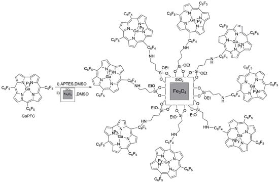 The core/shell nanoparticles were functionalized with GaPFC in a two-step procedure: In the first step, a nucleophilic substitution reaction was promoted between the para-fluorine atoms of pentafluorophenyl rings of GaPFC with (3-aminopropyl)triethoxysilane (APTES) [19]. In the second step, silica-coated Fe3O4 nanoparticles were added to the previous mixture in order to promote the chemical grafting of GaPFC previously functionalized with APTES.