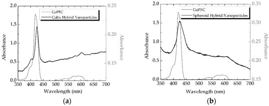 In order to confirm the presence of the corrole macrocycle linked onto the surface of Fe3O4@SiO2 nanoparticles, the UV-Vis spectra of the hybrid nanoparticles in ethanol were collected. Figure 2 shows that both cuboid (Figure 2a) and spheroid (Figure 2b) magnetic functionalized samples exhibited the characteristic Soret band of GaPFC but redshifted from 419 nm to 424 nm in relation to the pure complex. The background signal of the absorbance curves was due to light scattering and is typical of aggregated nanoparticles. In fact, this might have been an indication that the GaPFC molecules grafted at the SiO2 surfaces of the core/shell nanoparticles were interacting due to their proximity as a consequence of particle aggregation. The broadening of the Q band at 602 nm (for cuboid particles) and 607 nm (for spheroid particles) in the UV-Vis spectra of the hybrids was also consistent with aggregation effects occurring in the colloidal functionalized particles in ethanol.