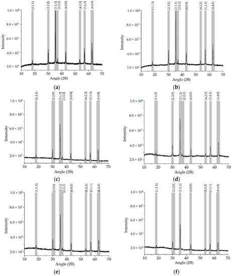X-ray diffractograms of (a) cuboid Fe3O4 nanoparticles, (b) cuboid Fe3O4@SiO2 nanoparticles, (c) cuboid hybrid nanoparticles, (d) spheroid Fe3O4 nanoparticles, (e) spheroid Fe3O4@SiO2 nanoparticles, and (f) spheroid hybrid nanoparticles.