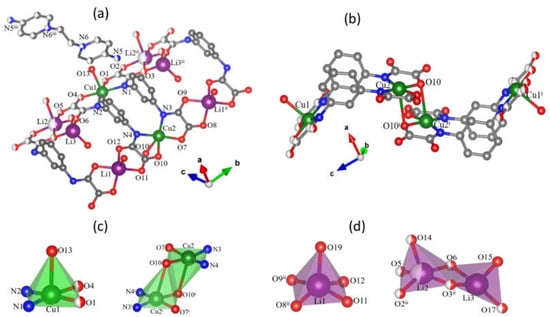 (a) Perspective view of the dicopper [,] metallacyclophane-type fragment of 1 with the atom labelling scheme. Carbon and hydrogen atoms are displayed as dark and light gray spheres. Atoms with half of sphere in white represent the disordered atoms. Hydrogen atoms were omitted for clarity. (b) The crystal structure of the centrosymmetric tetracopper(II) [Cu4(μ-mpba)4(H2O)2]8− fragment in 1 [symmetry code: (i) = 2 − x, 1 − y, 1 − z; (ii) = x, 1 − y, z]. (c) Coordination polyhedra of the copper(II) and (d) lithium(I) ions, respectively. Atomic displacement ellipsoids of 1 can be found in the Supplementary Information, Figure S5.