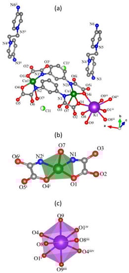 (a) Representation of a fragment of the structure of 2. Carbon and hydrogen atoms are displayed as dark and pale gray spheres. Two chlorine atoms are present since each position is equivalent to half of the occupancy for this atom. Crystallization water molecules are hidden for the sake of clarity [symmetry code: (i) = 5/2 − x, y, 2 − z; (ii) = 5/2 − x, −1/2 − y, 3/2 − z; (iii) = 3/2 − x, y, 2 − z; (iv) = −1 + x, y, z]. (b) Coordination polyhedron of the copper atom. (c) Coordination polyhedron of the potassium atom.