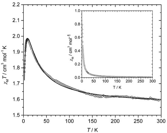 Magnetic properties of 1 in the form of the χMT versus T plot [χM is the magnetic susceptibility per four copper(II) ions] are shown in Figure 5. χMT at 300 K is equal 1.59 cm3 mol−1 K, a value which is consistent with the presence of four magnetically isolated spin doublets (ca. 1.58 cm3 mol−1 K for SCu = ½ and gCu = 2.05). Upon cooling, a smooth increase of χMT occurs below 100 K to reach a maximum of 1.98 cm3 mol−1 K at 9.0 K and exhibiting a further decrease to 1.77 cm3 mol−1 K at 2.0 K. This plot is typical of an overall ferromagnetic behavior, the small decrease at very low temperatures being most likely due to very weak (intra/intermolecular) antiferromagnetic interactions and/or zero-field splitting effects. No maximum of χM is observed in the χM against T plot (see inset in Figure 5).