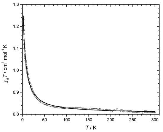 The magnetic properties of 2 in the form of χMT against T plot [χMT is the magnetic susceptibility per two copper(II) ions] are shown in Figure 6. At room temperature, χMT is equal to 0.81 cm3 mol−1 K, a value which is as expected for two magnetically non-interacting spin doublets. Upon cooling, this value remains practically constant until 150 K and it further increases continuously to reach 1.24 cm3 mol−1 K at 2.0 K. This plot is typical of an overall ferromagnetic behavior.