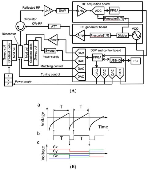 (A) Schematic of the in vivo digital EPR imager [26]; (B) timing chart and signals for the (a) field scan, (b) trigger pulse used for the data acquisition window with a period of T, and (c) 3D field gradients Gx, Gy, and Gz.
