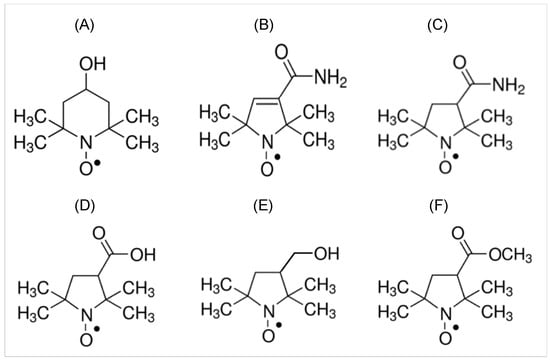 Nitroxide imaging probes used for EPR imaging: (A) Tempol, (B) CTPO, (C) CMP, (D) COP, (E) HMP, and (F) MCP.