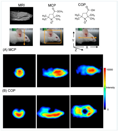 3D EPR images of mouse heads using BBB-permeable MCP and BBB-impermeable COP were taken (Figure 3). The EPR images showed that MCP is distributed mainly inside the brain, but COP is distributed mainly outside the brain. Partition coefficients of MCP and COP between n-octanol and water were used as indices of the lipophilicity of these nitroxides, with the values suggesting the different distributions of these probes in mouse heads [25,30].
