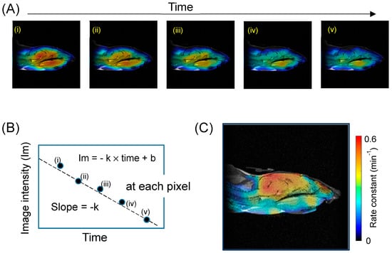 The series of EPR images can be used to follow time-dependent changes in each voxel within the image (Figure 4A). The rate constants of the reduction reaction of the nitroxide probe for each pixel of the 2D temporal EPR images were calculated, and the 2D spatial mapping of pseudo-first-order rate constants of nitroxide imaging probes were presented in “redox mapping” of a subject sample. The use of redox mapping enables not only changes in the redox status of a subject to be followed, but also identification of organ-specific characteristics of the redox balance [44,45,46].