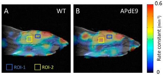 Coregistration of the redox map and the anatomical magnetic resonance imaging (MRI). The 2D spatial mapping of pseudo-first-order rate constants of nitroxide imaging probes were presented in “redox mapping” of examined mouse heads. Redox maps of a wild type (WT, (A)) and AD (APdE9, (B)) model mice. ROI-1: ROI in the hippocampus; ROI-2: ROI in the midbrain. Adapted from [50].