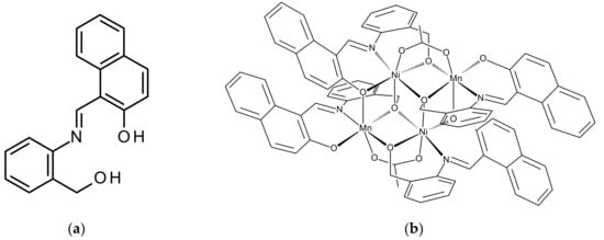 - Yoshitake, M.; Yoneda, K.; Yamada, Y.; Koikawa, M. Synthesis and crystal structure of a tetranuclear Mn(III)-Ni(II) heterometal complex of N-(2-oxymethylphenyl)salicylideneimine. X-ray Struct. Anal. Online 2016, 32, 1–2. [Google Scholar] [CrossRef]