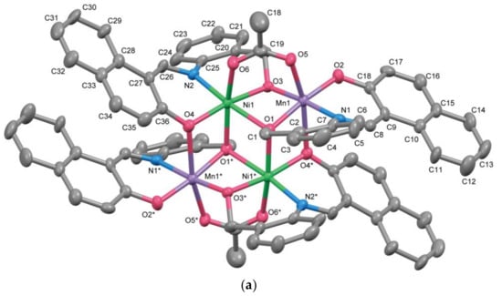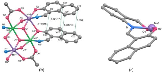 The obtained crystals of 1 were unstable and efflorescence due to the large voids with highly volatile dichloromethane molecules. Many solvent systems were tested for recrystallization, but our attempts were in vain. All measurements were terminated by the cracking of the single crystals. Though the analytical results are insufficient to make a crystallographically accurate discussion, they clearly reveal the molecular structures to confirm the geometries of metal ions. As shown in Figure 2a, 1 has a tetranuclear structure with an inversion center. The final refined structural model of 1 is characterized by an asymmetric unit containing a Mn(III) ion and a Ni(II) ion, two (L)2− ligands, and one acetate anion. The Mn and Ni ions in the asymmetric unit of 1 rest on a dinuclear plane defined by a [MnNi(L)2] unit with bis-μ-alkoxo bridges from two deprotonated tridentate (L)2− ligands. Furthermore, an acetate anion is also present that act as syn–syn bridging ligand coordinating the hetero-metals (Mn and Ni) at their axial positions. The symmetrically-related dinuclear units are linked to each other by two μ3-alkoxo (O1 and O1*) and two μ2-phenoxo (O4 and O4*) bridging atoms. Consequently, the tetranuclear hetero-metal core in 1 is best represented as a dimer-of-dimers. The metal atoms arrangement with bridging oxygen atoms in 1 can be viewed as the distorted defective double-cubane core structure. The valence states of the metal ions are confirmed by charge balance considerations, bond valence sum (BVS) calculations [18], and observations of Jahn-Teller elongations. The calculated BVS values are 3.25 and 2.22 for the Mn(III) and Ni(II) ions, respectively [19]. The coordination environment of Mn1 is a distorted octahedral geometry in which the equatorial positions are occupied by three oxygen atoms (O1, O2, and O3) and one nitrogen (N1) atom, whereas the axial positions are occupied by two oxygen atoms (O4* and O5). The bond distances in the equatorial plane of Mn1 are in 1.882(8)–1.981(9) Å range. The axial bond distances [2.135(7) and 2.410(7) Å] are longer than their counterparts in the equatorial plane, due to Jahn-Teller distortions that are typical for Mn(III) ions. The coordination geometry of Ni1 is also octahedral. The combination of atoms coordinating Ni1 is the same as that coordinating Mn1. However, the deviation of coordination bond distances [1.986(7)–2.141(7) Å] of Ni1 is within 0.155 Å, a substantially smaller value than in the case of Mn1. These distances are in the normal ranges for Mn(III) and Ni(II) complexes with Schiff-base ligands [16,20]. The syn–syn bridging acetate forces the structure to be folded with the value of the bent angle of the Mn(μ-O2)Ni bridging fragment being equal to 15.8(2)°. The intramolecular metal-to-metal distances between Mn1···Ni1, Mn1···Ni1*, Ni1···Ni1*, and Mn1···Mn1* are 2.928(2), 3.255(2), 3.253(2), and 5.286(3) Å, respectively. The bond angles subtended by the μ3-alkoxo are 91.5(3)° for Mn1–O1–Ni1, 106.1(3)° for Mn1–O1–Ni1*, and 99.3(3)° for Ni1−O1−Ni1*. The short Mn1···Ni1 distance and narrow Mn1−O1−Ni1 angle is a common feature of syn–syn carboxylato bridging dinuclear structures [21]. The interdimer Mn1···Ni1* is much longer than the intradimer Mn1···Ni1 counterpart; additionally the bond angles Mn1−O1−Ni1* and Ni1−O1−Ni1* are much larger than 90°. Hence, the defective double-cubane core of 1 is highly distorted in the rhombic direction. Notably, the distorted core structure might be stabilized by intramolecular π−π stacking interactions as shown in Figure 2b [C9···C36* = 3.197(15), C11···C28* = 3.565(18), C13···C32* = 3.88(2), and C15···C34* = 3.621(17) Å, (*) −x + 1, −y, −z] between naphthyl groups belonging to the two asymmetric dimer units.
