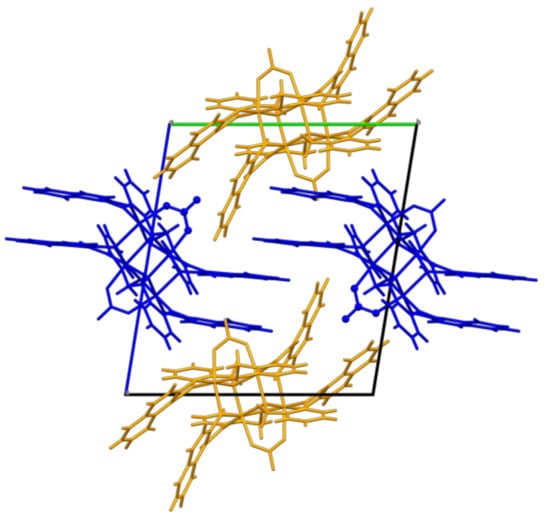 Packing view along the a-axis of 2. Crystal solvents are omitted for clarity. Complex 2A and 2B are color coded with blue and orange, respectively.