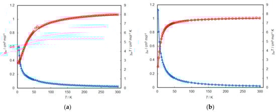 Temperature dependence of χm (blue triangles) and χmT (red circles) vs. T plots of 1 (a) and 2 (b). Solid lines are drawn with the best-fitted parameter values described in the text and in Table 2.
