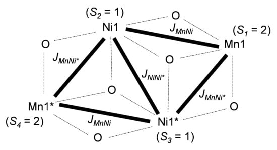 where JMnNi is the exchange integral between the Mn and Ni ions in the asymmetric unit bridged by acetate or nitrate, whereas JMnNi*, JNiNi*, and JMnMn* are the exchange integrals between the metal ions located in the asymmetric units as defined in Scheme 1.