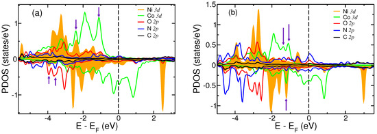 In the case of molecular chemisorption, electrons in the outer-plane -orbitals of the quinonoid strongly interact with the surface state electrons and form chemical bonds between the molecule and surface atoms. As a result, the Ni–O(N) bond lengths are stretched, which leads to a significant reduction of the LF effect and subsequently reduces the orbital energy. In this situation, the intra-atomic exchange interaction becomes important and the electrons occupy the Ni- orbitals according to Hund’s rule. Hence, the orbital level, which was completely unoccupied before, is now partially occupied (see Figure 5b,c). This explains the change in the spin state of a chemisorbed NiQ molecule governed by the shift in the energy level of the orbital, as shown in Figure 5.