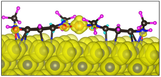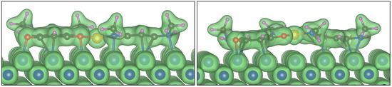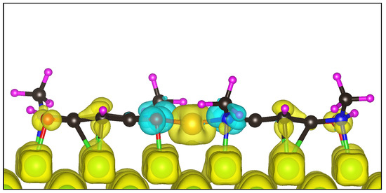 In the case of chemisorption of the molecule in the TOP configuration, the direct O and N atoms bonding to the Ni atom are in the hollow position with respect to the surface atoms and do not directly bond to the surface Co atoms; however, there are other atoms of the quinonoid ligand that chemically bond to the surface. The total charge density plot in Figure 7 (right) clearly indicates the non-overlapping nature of the orbital wave functions between the central Ni atom and the surface. However, quinonoid ligand atoms of the molecule strongly interact with the surface Co atoms. There are overlapping peaks present in the atom-projected PDOS plot (Figure 6b) marked with vertical arrows, which indicates the strong hybridization between out-of-plane orbitals () of surface Co with O and N orbitals. The magnetization density calculated for the TOP configuration is shown in Figure 9. A small negative magnetization density is present on the ligand atoms, as shown by the light blue isosurface that indicates an indirect exchange interaction between the Ni spin center and the magnetic Co surface atoms, mediated through the ligand.