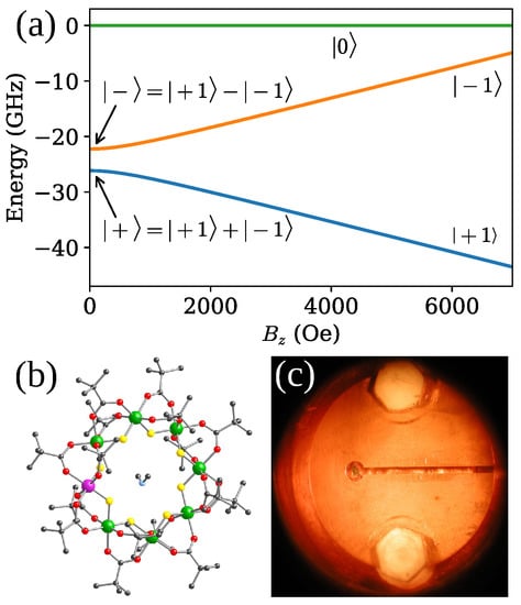 Cr7Mn ([(CH3)2NH2][Cr7MnF8((CH3)3CCOO)16]) is a paramagnetic ring, shown in Figure 1b [,]. At low-temperature, it has a ground-state spin of that can be described by the spin Hamiltonian