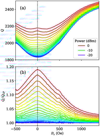 (a) resonator Q vs. applied magnetic field at 4.00 GHz and powers from −20 to 0 dBm; (b) resonator Q divided by the Q at –20 dBm to emphasize the decoupling effect. The sharp peak around zero field suggests that this decoupling is associated with the clock transition.