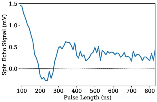 Spin echo signal as a function of the length of the extra pulse, at 4.43 GHz and 0 Oe. The resulting Rabi oscillations confirm that our signal comes from spin echo. The offset is an artifact of our background-subtraction method.