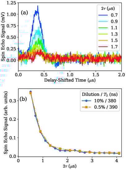 We used custom loop-gap resonators for our ESR experiments, and tuned their frequencies by inserting a dielectric into the gap. Our sample sat in the loop of the resonator, as shown in Figure 1c, and we coupled radiation into the system through antennae above the loop and/or the gap. Continuous wave measurements were done using a vector network analyzer (KeySight E5063A, Santa Rosa, CA, USA). Pulsed experiments were performed using a homemade pulsed-ESR spectrometer, configured to perform a Hahn echo sequence. Two RF pulses were sent to the resonator, the first with a duration such that it tipped the spin state by an angle of , followed after a time by a second pulse which tipped the state by an angle of , producing a “spin echo” a time after the second pulse, resulting in the sequence echo. Fitting the dependence of the echo signal on to an exponential decay gives a time constant of . We also performed background subtraction in one of two ways. For our preliminary experiments, we took data at a low field and a much higher field, where the sample is no longer coupled to the resonator; subtracting the two signals removes the background. For our experiments, we alternated sending in a pulse several μs before the pulse. This extra pulse inverts the echo; subtracting signals with this extra pulse from signals without the extra pulse removes the background while effectively doubling our echo signal.
