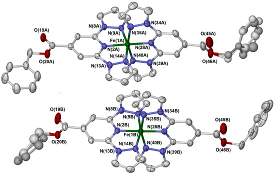 Recrystallization of [Fe(L3)2][BF4]2 from nitromethane/diethyl ether gave mixtures of two crystal forms, which were readily distinguished by their dark red and bright yellow colouration and proved to be polymorphs of formula [Fe(L3)2][BF4]2·2MeNO2 (Figure 1). Both polymorphs exhibit the triclinic space group P but with significantly different unit cell parameters. Crystals of the major red α-polymorph are low-spin at 120 K according to the metric parameters at the iron atom, while the minor yellow β-polymorph is high-spin at the same temperature (Table 1). As well as the expanded FeN6 coordination sphere expected for a high-spin complex [50], the coordination geometry of the β-polymorph is significantly more distorted away from the idealized D2d symmetry expected for this ligand combination. This is evident in the trans-N{pyridyl}−Fe–N{pyridyl} angle (φ), and the dihedral angle between the least squares planes of the heterocyclic cores of the two L3 ligands (θ). Both parameters in the α-polymorph are close to their idealized values of 180 and 90°, respectively (Table 1), which is to be expected in low-spin [Fe(bpp)2]2+ derivatives [22]. However, the β-polymorph exhibits reduced values of φ = 166.41(12)° and θ = 79.90(3)°. Deviations of these parameters from their ideal values are common in high-spin compounds [24] and reflect an angular Jahn–Teller distortion of the high-spin 5T configuration [51,52]. Since the distortion is only a property of the high-spin molecules, distorted molecules must rearrange to a more regular coordination geometry during spin-crossover, which can be inhibited in a rigid solid lattice. In practice, spin-crossover is rarer in complexes exhibiting φ < 172° in their high-spin form, as in β-[Fe(L3)2][BF4]2·2MeNO2 [53].