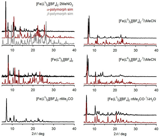 Measured (black) and simulated (red, grey) X-Ray powder diffraction data from the complexes in this work. No crystallographic simulation is available for [Fe(L5)2][BF4]2·nMe2CO.