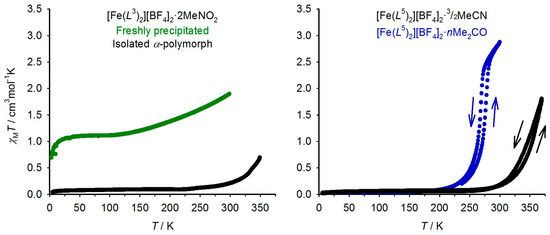 Variable temperature magnetic susceptibility data for different preparations of [Fe(L3)2][BF4]2·2MeNO2 (left) and [Fe(L5)2][BF4]2 (right), at a scan rate of 5 K min−1. Data for [Fe(L3)2][BF4]2·2MeNO2 were measured on a cooling temperature ramp only.