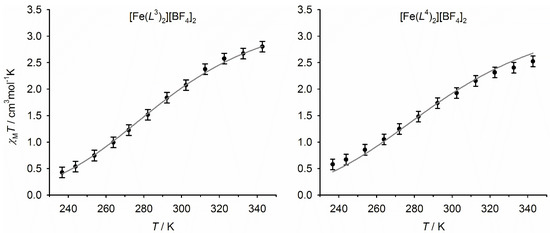 Magnetic susceptibility data for [Fe(L3)2][BF4]2 (left) and [Fe(L4)2][BF4]2 (right) in CD3CN solution. The lines show the fits of the data to Equations (1) and (2).