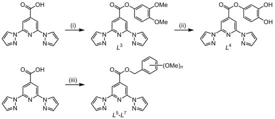 2,6-Di(pyrazol-1-yl)pyridine-4-carboxylic acid was prepared by the literature route, from pyrazole and 2,6-dibromopyridine-4-dicarboxylic acid (Scheme 2) [47]. Refluxing this precursor in thionyl chloride converted it in situ to 2,6-di(pyrazol-1-yl)pyridine-4-carbonyl chloride, which was then treated with 3,4-dimethoxyphenol to afford L3 in 55% overall yield. Conversion of L3 to L4 was achieved in 69 % yield using a ten-fold excess of boron tribromide. Alternatively, reaction of 2,6-di(pyrazol-1-yl)pyridine-4-carboxylic acid with the appropriate benzyl alcohol, in the presence of the coupling agent N,N-dicyclohexyl carbodiimide (DCC) and catalytic 4-(dimethylamino)pyridine (DMAP), gave L5–L7 in low-to-moderate recrystallized yields. The identities of all the ligands were confirmed by 1H and 13C NMR and HR-ESMS spectrometry, while four of the new ligands were also characterised by X-Ray crystallography.