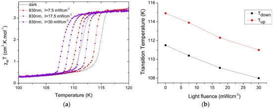 The effect of light on the thermal hysteresis of the present compound is presented in Figure 3a, where is measured for several light intensities of an 830 nm excitation, at a temperature scan rate of 0.5 K min−1. At first sight, one can easily remark that the increase of the light intensity excitation results in the shift of the thermal hysteresis to low-temperature regions. This trend is expected for a light-induced heating effect. On the other hand, the plot of the upper and lower transition temperature as a function of the intensity of light (Figure 3b) show that the hysteresis width remains almost constant in this process.