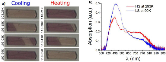 Figure 4a depicts some selected snapshots of the single crystal [{Fe(NCSe)(py)2}2(m-bpypz)] transformation in the vicinity of the spin transition, recorded at a scan rate of K min−1 with a relatively weak light intensity of the microscope, mW cm−2. For both cooling and heating processes, the snapshots of Figure 4a indicate that the spin transition on one single crystal proceeds through a single domain nucleation and growth mechanism, with a well identified HS–LS interface which propagates along the crystal length. The origin of such a single domain nucleation is attributed here to long-range elastic interactions between the SCO molecules, arising from the large crystal volume change (~3%) at the transition [66,67,68,69,70,71,72]. Indeed, the local volume change at the transition on each site is felt by the other molecules at long-range distances, due to an image pressure (negative in the case of positive volume misfit and positive in the opposite case) [73,74] traveling from the crystal boundary (the surface) in the form of an acoustic wave. As a result, the nucleation from the border of the crystal, which can be initiated randomly (a stochastic process) or by the existence of temperature gradients, generates long-range stresses, which prevent the nucleation from other sites, in the case of strong cooperative systems. The thermo-chromic transformation from the diamagnetic LS state to the paramagnetic HS state of the single crystal, illustrated in Figure 4a is consistent with the optical spectra, reported in Figure 4b, where we can clearly identify the absorption bands of the LS and HS states.