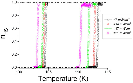 As mentioned above, the thermal dependence of the HS fraction, derived from the evolution of the average optical density of the single crystal, presented in Figure 5, shows a global and monotonous shift of the thermal hysteresis to lower temperature regions, as clearly confirmed by the decrease of the cooling and heating transition temperatures of the thermal hysteresis. This behavior is attributed to the photo-heating effects produced by light absorption, which obviously favors the HS state. It is worth noting that this behavior is different from that arising from the temperature scan rate kinetics which affect equally both branches of the thermal hysteresis and keeps the middle of the thermal hysteresis invariant [53,75,76,77].