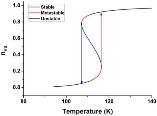 Then changing from to by accounting for the limits gives, in a unique way, the associated temperature, . An example of the thermal dependence of the HS fraction in the case of the first-order transition is given in Figure 7, where the stable, metastable, and unstable states are clearly highlighted.
