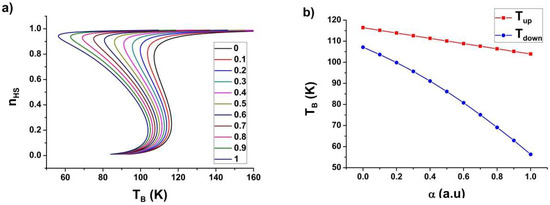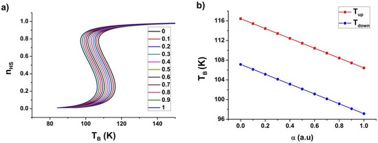 Figure 9a reports the bath-temperature dependence of the HS fraction for the same intensity values with a negligible heat capacity difference between the LS and HS states, i.e., , while are different from zero. The results show the previous dissymmetry observed in the shift of the upper and lower switching temperature disappears, leading to a linear decrease of the transition temperatures as a function of the light intensity (Figure 9b), in very good qualitative agreement with the above magnetic and optical microscopy experimental results.